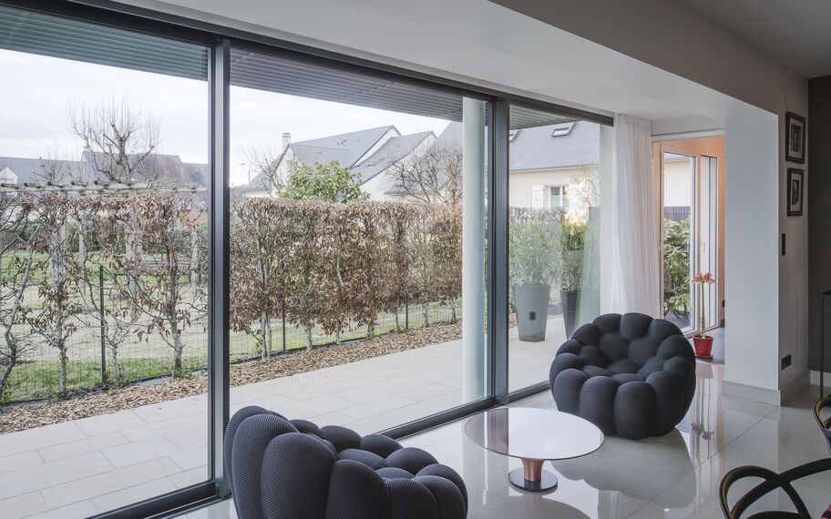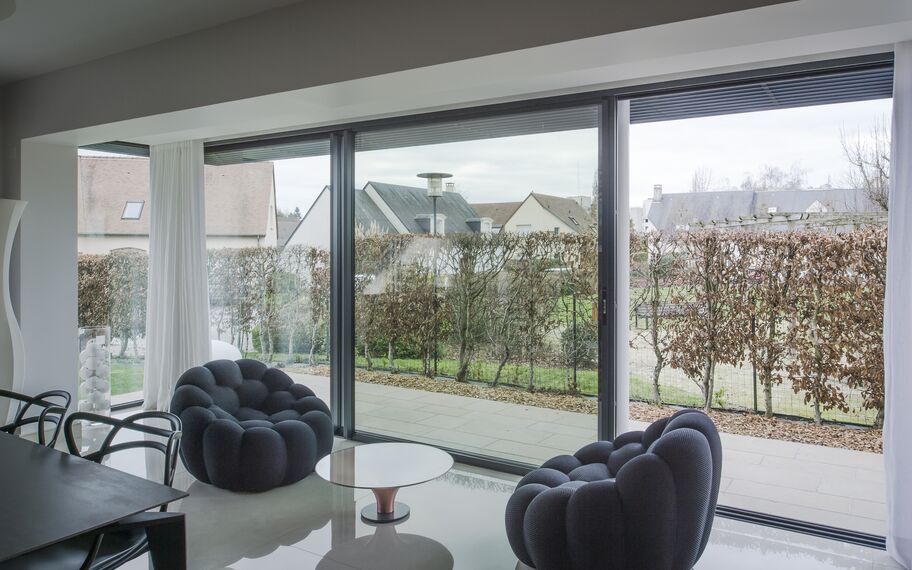 P.M : Je souhaitais agrandir le volume de mon séjour en réalisant une extension sous un balcon existant à l’étage. A l’origine, la maison s’arrêtait à l’aplomb de ce balcon, et nous avons donc ouvert toute la façade avant en rez-de-chaussée pour gagner ainsi une surface intérieure d’une dizaine de mètres carrés. Je souhaitais éviter toute maçonnerie en façade, et avoir des châssis coulissants avec des profilés les plus fins possibles pour un maximum d’ouverture et de clarté dans le salon. Cet ensemble vitré que je voulais très épuré avec une finition gris anthracite satiné offre vraiment une nouvelle volumétrie au salon. Ses trois vantaux de 2,50 m chacun, se rabattant sur les deux tiers au centre ou sur les côtés permettent une ouverture panoramique.